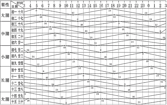 因为潮汐时间总在不停的变化,以上时间只是一个相对标准时间,可能与实际的潮汐时间有出入,可能差几分钟到十几分钟。每个农历月的初一、十五的早上六点和下午18:00潮位涨到最高,中午12:00和凌晨0:00降到最低。然后每天涨潮落潮时间往后拖延48分钟告诉你一个口诀:初八二十三,一天两个干;初一和十五,一天两个满干 就是落大潮,满 就是张满潮。查好农历,依次顺减即可,每天减去48分钟,很好记